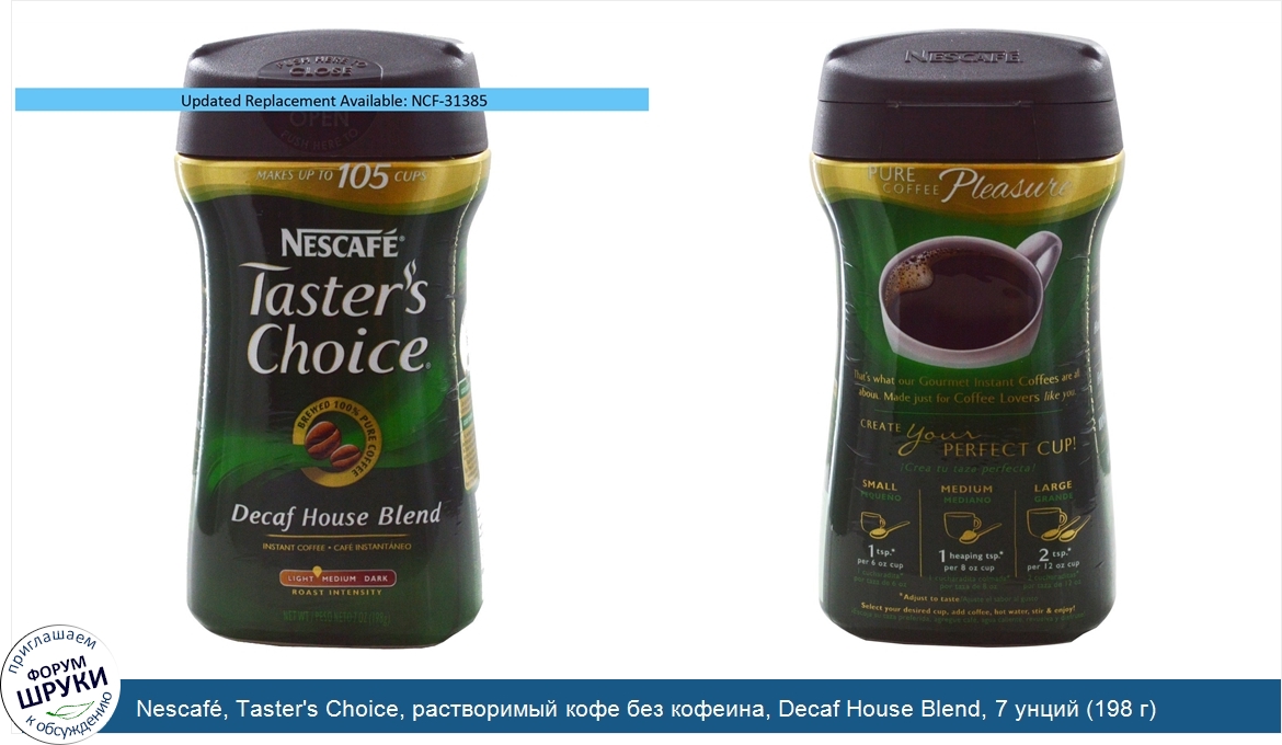 Друзья, если у вас есть отзыв/дополнение/комментарий/вопрос относительно Nescafé, Taster's Choice, растворимый кофе без кофеина, Decaf House Blend, 7 унций (198 г) - напишите его ответом в эту тему (это будет полезно всему сообществу в целом и вам в отдельности).