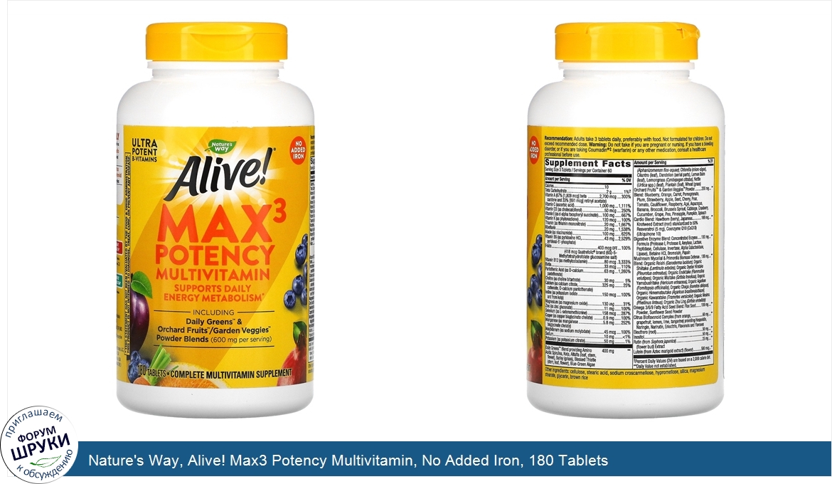 Друзья, если у вас есть отзыв/дополнение/комментарий/вопрос относительно Nature's Way, Alive! Max3 Potency Multivitamin, No Added Iron, 180 Tablets - напишите его ответом в эту тему (это будет полезно всему сообществу в целом и вам в отдельности).