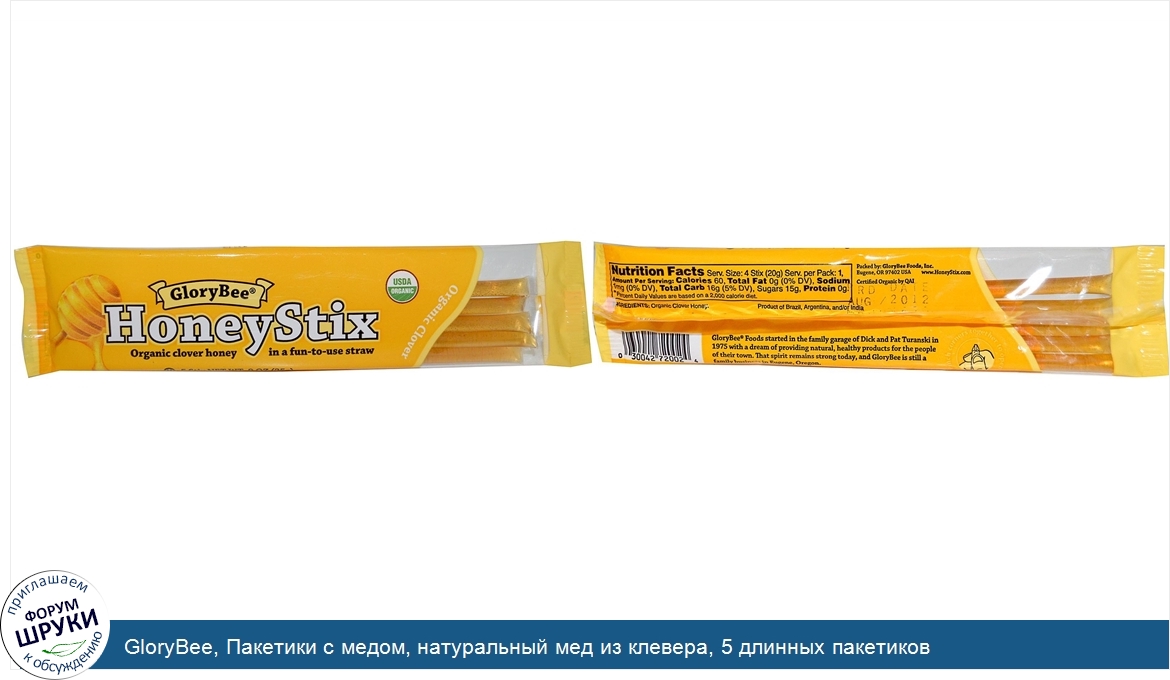 [DESCRIPT]Сертифицировано USDA. Натуральный мед из клевера в забавной упаковке. Сертифицировано QAI. GloryBee Foods берет начало в гараже семьи Дика и Пата Турански в 1975 вместе с мечтой обеспечить жителей своего города натуральными здоровыми продуктами. Эта черта жива и сегодня, и GloryBee - это все еще семейный бизнес в Юджине, штат Орегон.[/DESCRIPT]... (описание дополняется)
