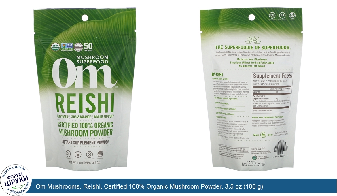 [DESCRIPT]USDA Organic. Non GMO Project Verified. 2,000 mg Per serving - OM Grown Mushrooms. 50 Servings. Mushroom Superfood. Adaptogen : Stress Balance : Immune Support. Dietary Supplement Powder. Gluten-Free. Vegan. No Sugar Added. Keto-Friendly. Paleo-Friendly. Mushroom Your Microbiome. Functional Without Anything Funky Added. No Nutrients Left Behind. No Artificial or Synthetic Ingredients. Tested for Heavy Metals. Complete Transparency ID Testing. Certified Kosher by Earthkosher. Certified Organic by Organic Certifiers. Mushrooms Are Our Mantra. Ommmmm. The Superfoodie of Superfoods. Mushrooms contain many unique bioactive nutrients that can't be found in plant or animal sources alone. Each serving of Om provides 2,000 mg of Certified Organic Mushroom Powder. Reishi. 'Shroom Away Stress. Take on life's ups and downs with the adaptogenic support of organic Reishi. Functional mushroom adaptogens are believed by traditional herbalists to help the body cope with everyday physical and mental stress by restoring balance and immunity in a natural and healthy way. No wonder Reishi is called the king of mushrooms. Peace of mind from this most regal of 'shrooms. We Grow Our OM. We grow a diverse range of organic mushroom species at our indoor farm in California and capture the complete nutritional value of the growing cycle. Whole food mushrooms are important because they provide a full spectrum of active compounds to support optimal health. So you can bet your beta glucans they're effective.[/DESCRIPT]... (описание дополняется)