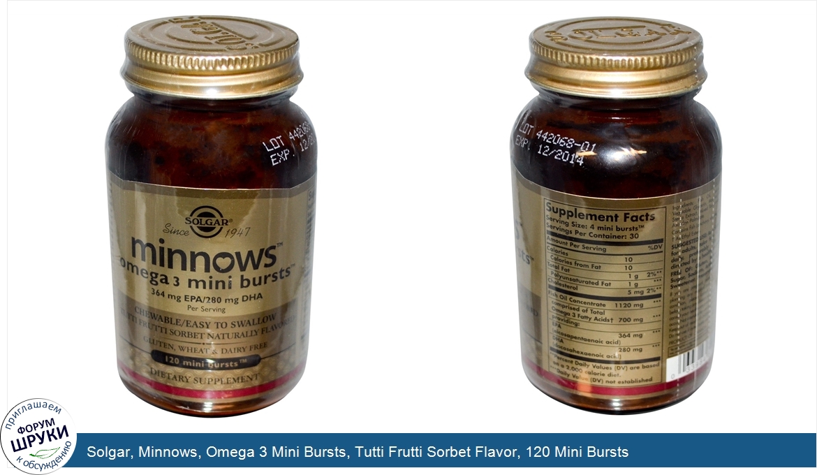 Друзья, если у вас есть отзыв/дополнение/комментарий/вопрос относительно Solgar, Minnows, Omega 3 Mini Bursts, Tutti Frutti Sorbet Flavor, 120 Mini Bursts - напишите его ответом в эту тему (это будет полезно всему сообществу в целом и вам в отдельности).