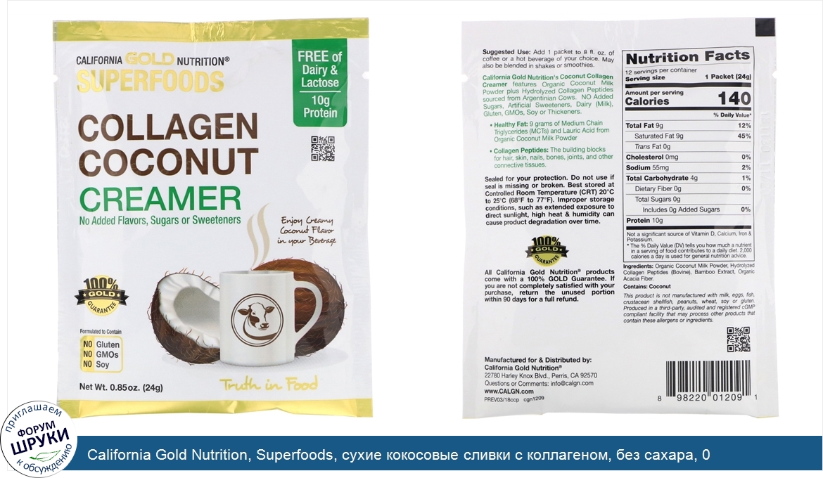 [DESCRIPT]. California Gold Nutrition® Superfoods. Collagen Coconut Creamer Packet. Featuring Organic Coconut Milk Powder Hydrolyzed Collagen Peptides. Delicious Support for Healthy Hair, Skin, Nails, Joints Bones*. 10 g Collagen,10 g Protein, Dairy Lactose Free. No Added Flavors, Sugars, Sweeteners or Thickeners. Formulated to Contain: No Gluten, No GMOs, No Soy. Produced in a 3rd Party Audited cGMP Registered (Certified) Facility. 100% Gold Guarantee. The creamy coconut flavor of this great tasting creamer comes with an added nutritional boost! Coconut is a rich source of Medium Chain Triglycerides (MCTs) and Lauric Acid and Collagen is the basic building block for healthy hair, skin, nails, joints and bones.* Together, these superfoods make a delicious addition to your diet any time of the day. Coconut Collagen Creamer. features Organic Coconut Milk powder plus Hydrolyzed Collagen Peptides sourced from Argentinian cows. There are no added sugars, artificial sweeteners, dairy milk, lactose, gluten, GMOs, or thickeners. Add it to your morning coffee, a mid-day shake or in the evening to create an extra healthy hot chocolate. California Gold Nutrition® Superfoods. Collagen Coconut Creamer. is manufactured in the USA and meets or exceeds all Quality Control standards. iHerb Blog: . The Collagen Connection. The Health Benefits of Coconut Oil. California Gold Nutrition®. Certificate of Analysis.[/DESCRIPT]... (описание дополняется)