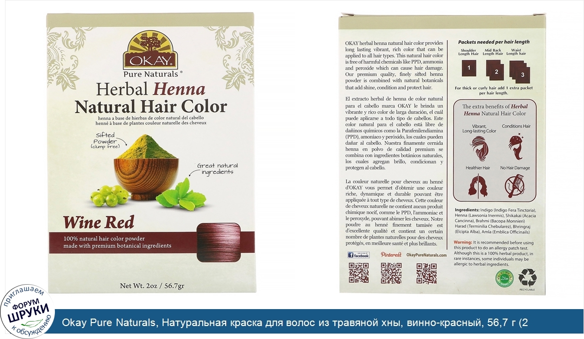 Друзья, если у вас есть отзыв/дополнение/комментарий/вопрос относительно Okay Pure Naturals, Натуральная краска для волос из травяной хны, винно-красный, 56,7 г (2 унции) - напишите его ответом в эту тему (это будет полезно всему сообществу в целом и вам в отдельности).