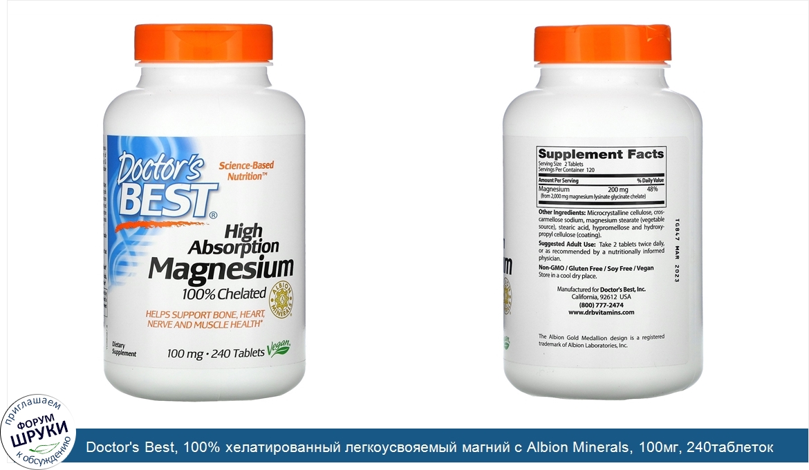 Друзья, если у вас есть отзыв/дополнение/комментарий/вопрос относительно Doctor's Best, 100% хелатированный легкоусвояемый магний с Albion Minerals, 100мг, 240таблеток - напишите его ответом в эту тему (это будет полезно всему сообществу в целом и вам в отдельности).