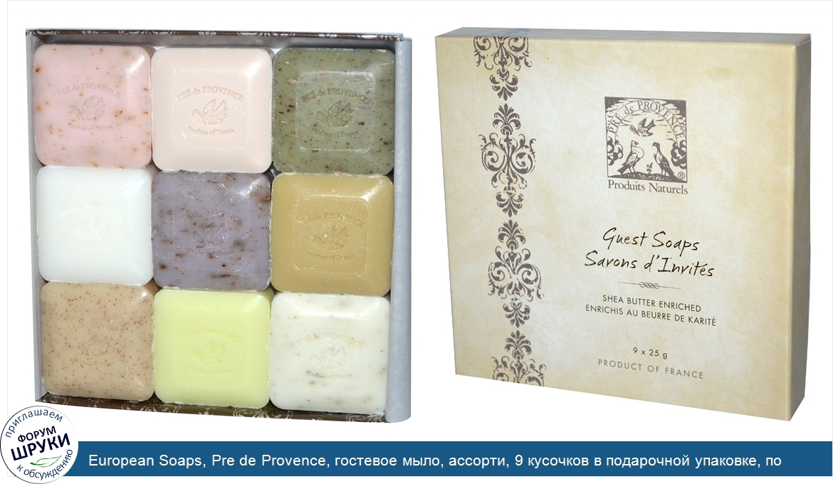 European Soaps, Pre de Provence, гостевое мыло, ассорти, 9 кусочков в подарочной упаковке, по 25 г каждый
