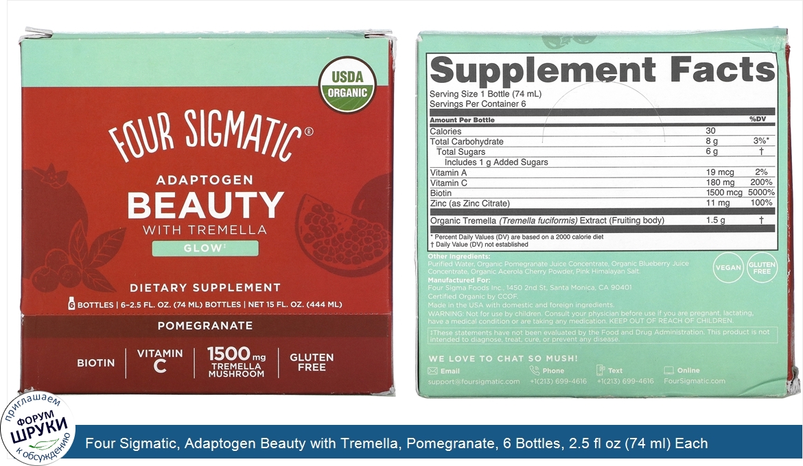 Друзья, если у вас есть отзыв/дополнение/комментарий/вопрос относительно Four Sigmatic, Adaptogen Beauty with Tremella, Pomegranate, 6 Bottles, 2.5 fl oz (74 ml) Each - напишите его ответом в эту тему (это будет полезно всему сообществу в целом и вам в отдельности).