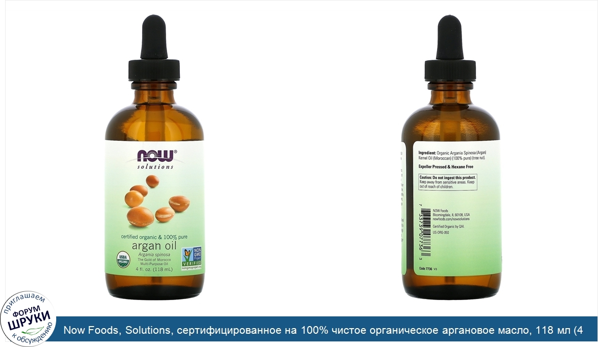 Now Foods, Solutions, сертифицированное на 100% чистое органическое аргановое масло, 118 мл (4 жидк.унций)
