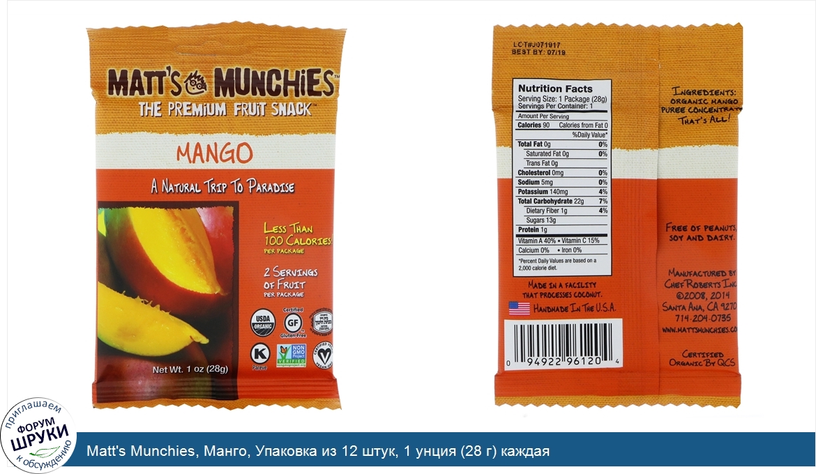 Друзья, если у вас есть отзыв/дополнение/комментарий/вопрос относительно Matt's Munchies, Манго, Упаковка из 12 штук, 1 унция (28 г) каждая - напишите его ответом в эту тему (это будет полезно всему сообществу в целом и вам в отдельности).