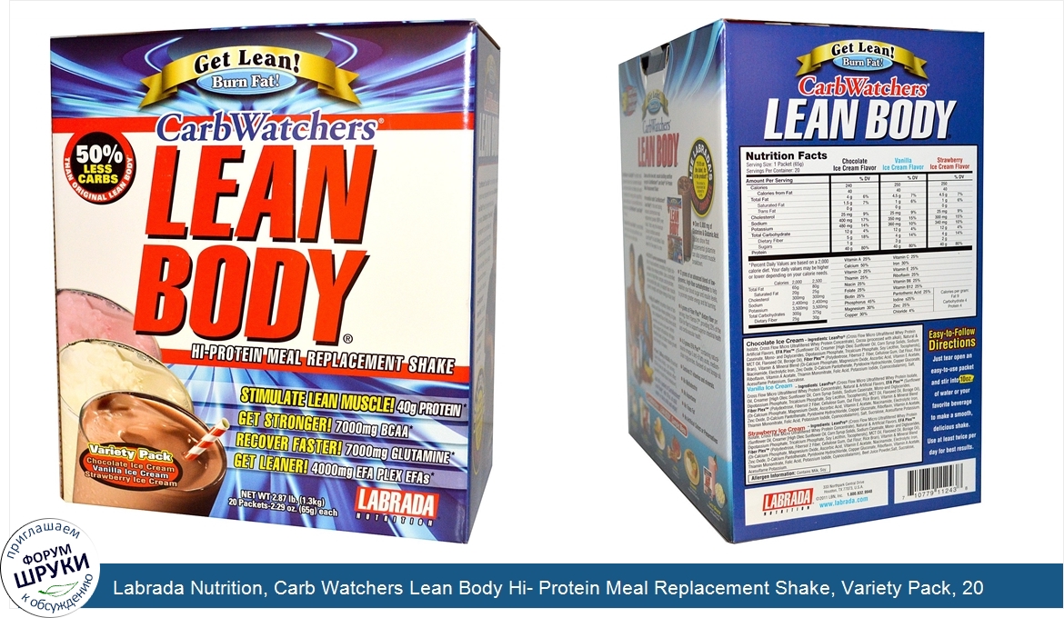 Друзья, если у вас есть отзыв/дополнение/комментарий/вопрос относительно Labrada Nutrition, Carb Watchers Lean Body Hi- Protein Meal Replacement Shake, Variety Pack, 20 Packets, 2.29 oz (65 g) Each - напишите его ответом в эту тему (это будет полезно всему сообществу в целом и вам в отдельности).