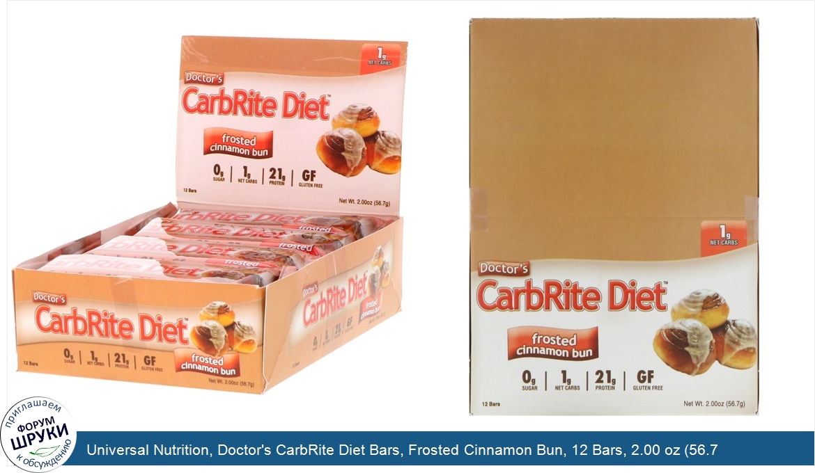 Друзья, если у вас есть отзыв/дополнение/комментарий/вопрос относительно Universal Nutrition, Doctor's CarbRite Diet Bars, Frosted Cinnamon Bun, 12 Bars, 2.00 oz (56.7 g) Each - напишите его ответом в эту тему (это будет полезно всему сообществу в целом и вам в отдельности).