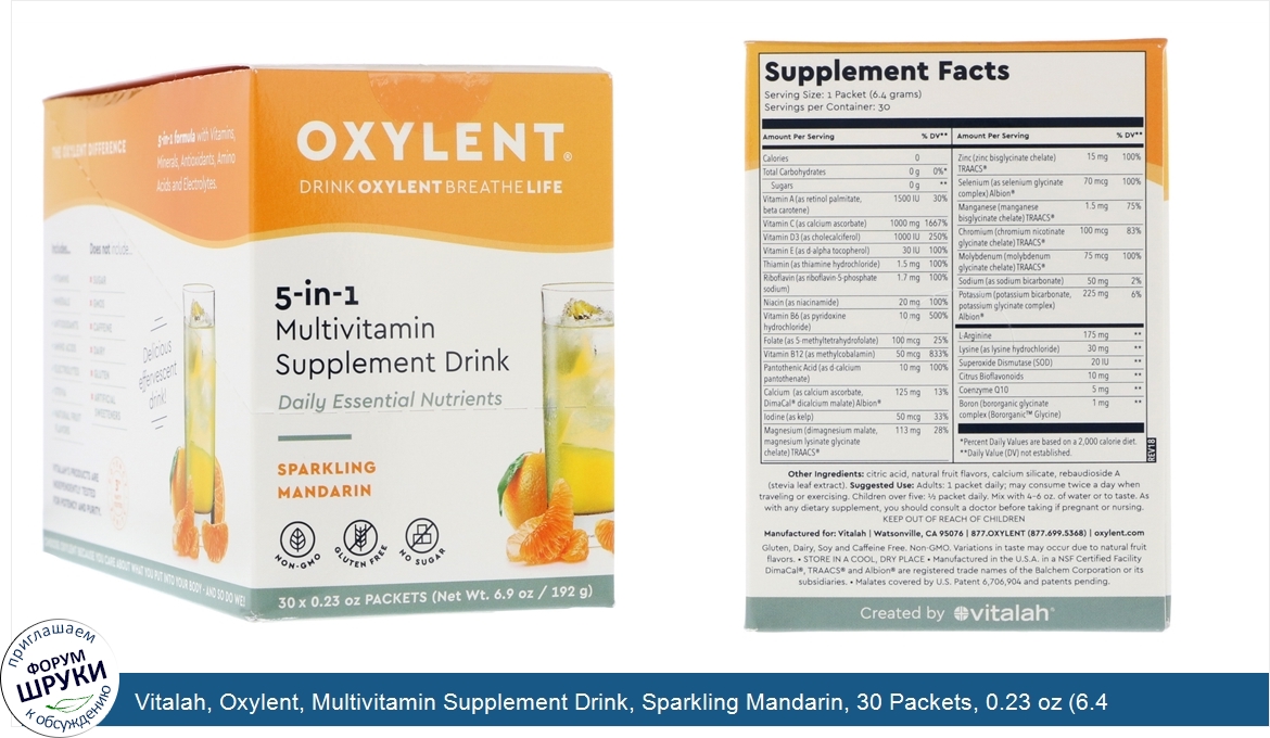 Друзья, если у вас есть отзыв/дополнение/комментарий/вопрос относительно Vitalah, Oxylent, Multivitamin Supplement Drink, Sparkling Mandarin, 30 Packets, 0.23 oz (6.4 g) Each - напишите его ответом в эту тему (это будет полезно всему сообществу в целом и вам в отдельности).