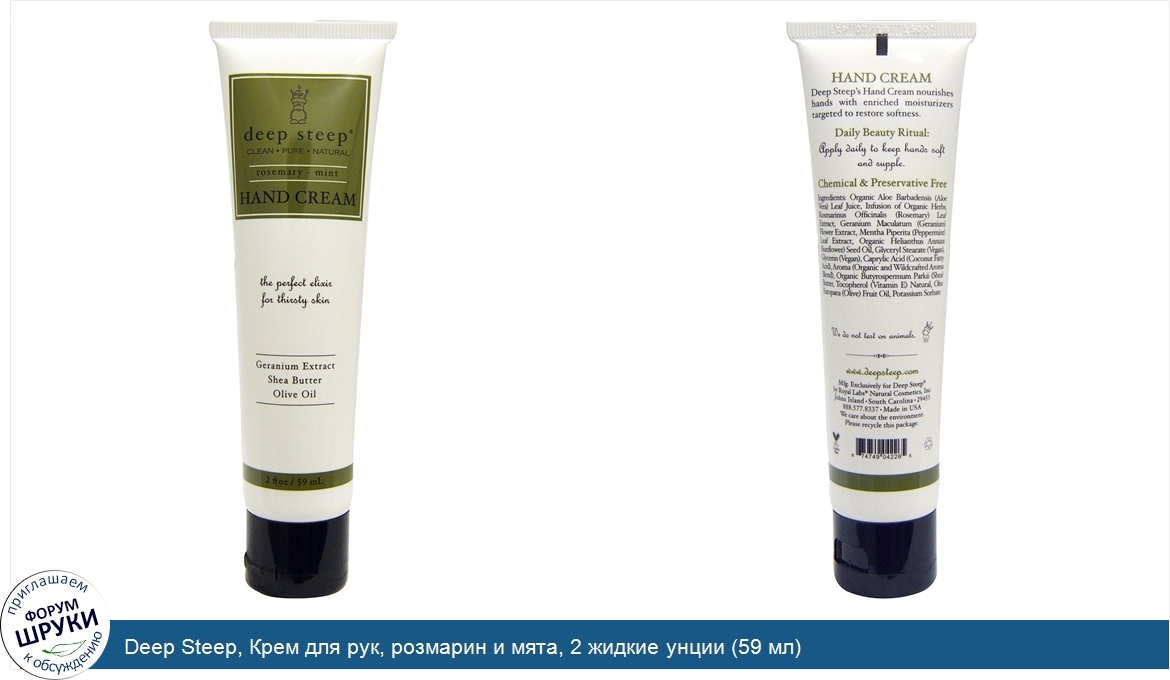 Друзья, если у вас есть отзыв/дополнение/комментарий/вопрос относительно Deep Steep, Крем для рук, розмарин и мята, 2 жидкие унции (59 мл) - напишите его ответом в эту тему (это будет полезно всему сообществу в целом и вам в отдельности).