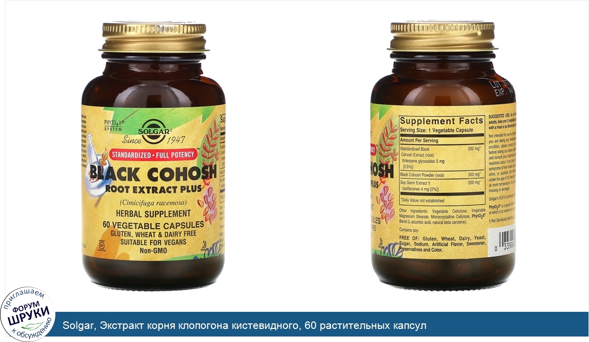 [DESCRIPT]PhytO. 2. X® System. Since 1947. Standardized. Full Potency. (Cimicifuga racemosa). Herbal Supplement. Gluten, Wheat Dairy Free. Suitable for Vegans. Non-GMO. Certified Gluten Free. Kosher Parve. Solgar® Standardized - Full Potency™ (SFP) Herbs are developed through a unique process that integrates the ideologies of both traditional herbalism and standardized herbal technology. To ensure consistent and reliable phytonutrient levels, we isolate a controlled amount of these important active plant compounds. Then, we blend these enhanced, "standardized" compounds with all of the components that occur naturally in the whole raw herb. The result is a potent, premium-quality standardized herbal extract with all of the synergistic and beneficial qualities found in nature.[/DESCRIPT]... (описание дополняется)
