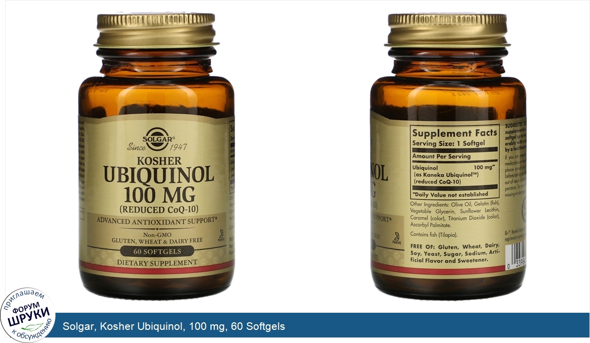 [DESCRIPT]Since 1947. (Reduced CoQ-10). Advanced Antioxidant Support. Non-GMO. Gluten, Wheat Dairy Free. K-Parve. Dietary Supplement. Made with Quality Kaneka Ubiquinol™. Coenzyme Q-10 (as ubiquinone) performs several important health supporting roles in the body. Ubiquinol (the reduced form of CoQ-10) provides advanced antioxidant support. By supplementing with Ubiquinol you are providing your body with a form of CoQ-10 that is in a ready-to-use state to fight free radicals. Free radicals can cause oxidative stress which may damage cells. Solgar® Kosher Ubiquinol 100 mg is offered in oil-based softgels to ensure optimal absorption and assimilation.[/DESCRIPT]... (описание дополняется)