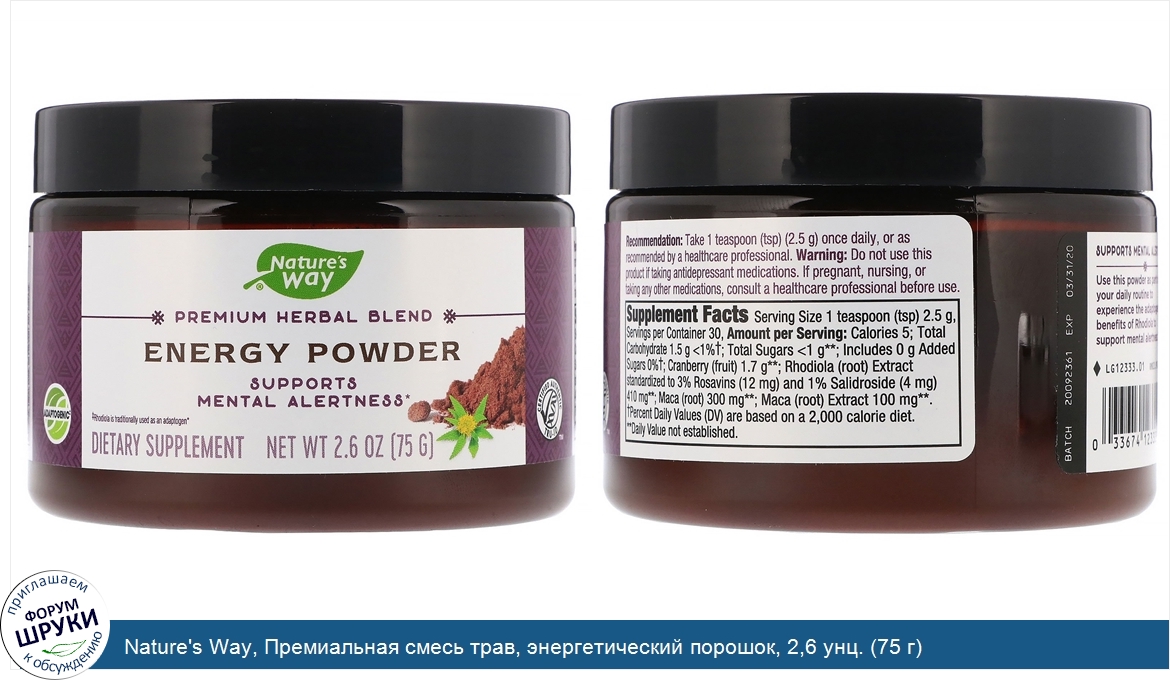 Друзья, если у вас есть отзыв/дополнение/комментарий/вопрос относительно Nature's Way, Премиальная смесь трав, энергетический порошок, 2,6 унц. (75 г) - напишите его ответом в эту тему (это будет полезно всему сообществу в целом и вам в отдельности).