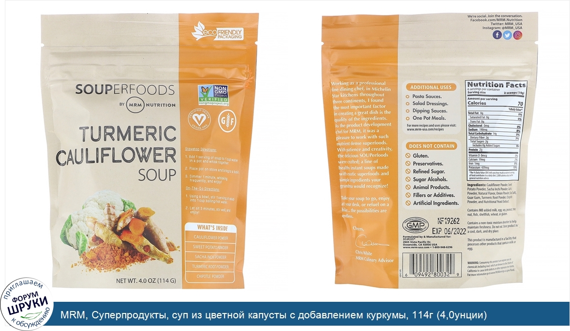 Друзья, если у вас есть отзыв/дополнение/комментарий/вопрос относительно MRM, Суперпродукты, суп из цветной капусты с добавлением куркумы, 114г (4,0унции) - напишите его ответом в эту тему (это будет полезно всему сообществу в целом и вам в отдельности).