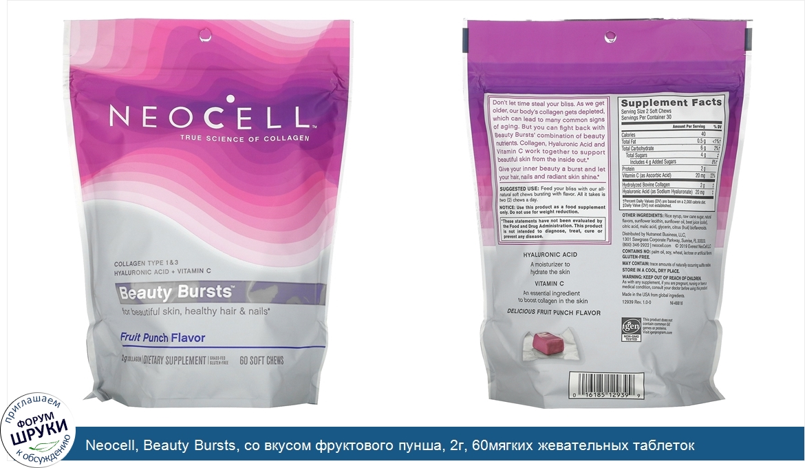 Друзья, если у вас есть отзыв/дополнение/комментарий/вопрос относительно Neocell, Beauty Bursts, со вкусом фруктового пунша, 2г, 60мягких жевательных таблеток - напишите его ответом в эту тему (это будет полезно всему сообществу в целом и вам в отдельности).