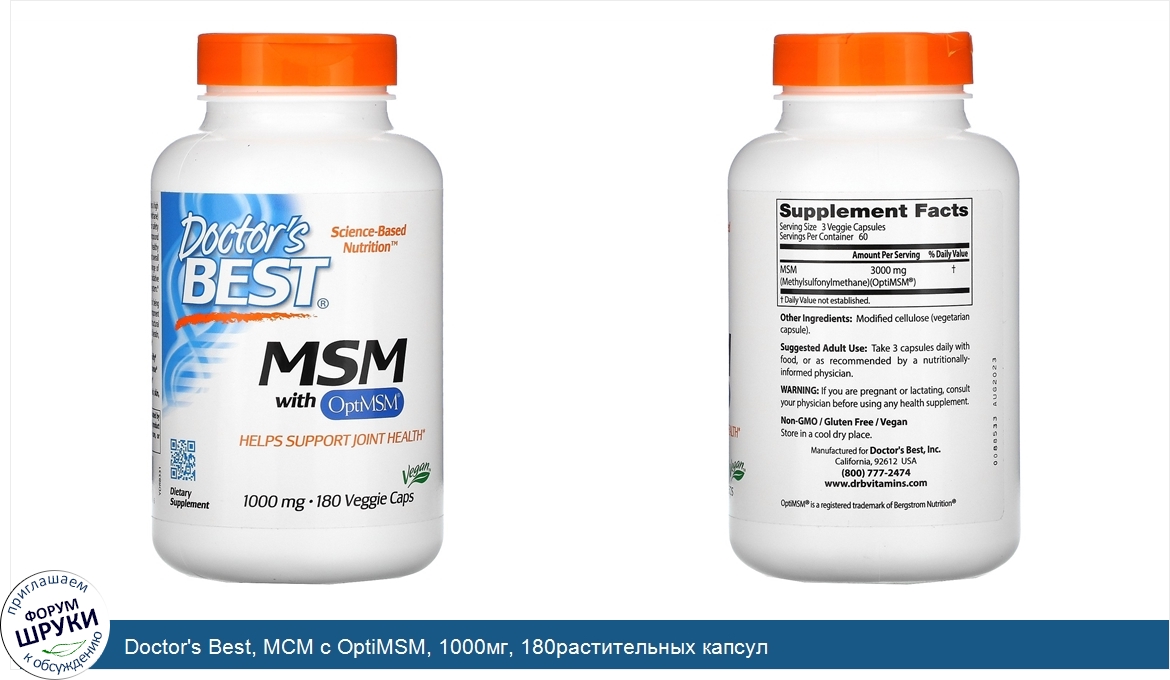 Друзья, если у вас есть отзыв/дополнение/комментарий/вопрос относительно Doctor's Best, МСМ с OptiMSM, 1000мг, 180растительных капсул - напишите его ответом в эту тему (это будет полезно всему сообществу в целом и вам в отдельности).