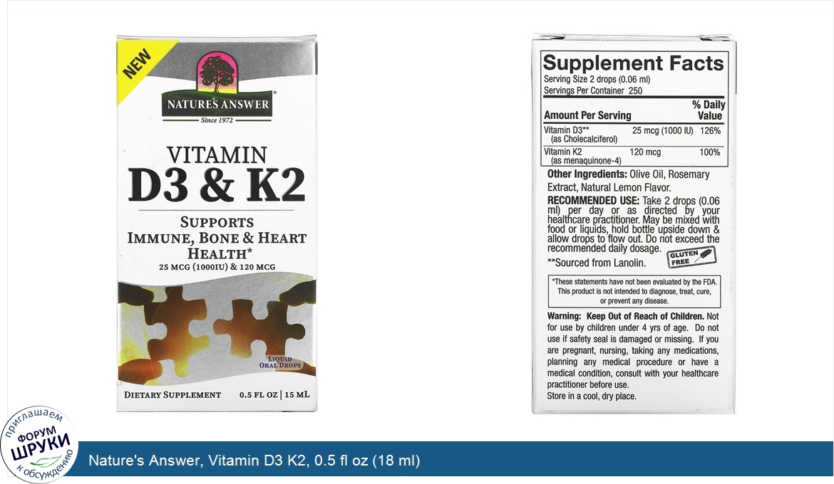 [DESCRIPT]Since 1972. Supports Immune, Bone Heart Health. Liquid Oral Drops. Dietary Supplement. Gluten Free. Nature's Answer®. Vitamin D3 K2 brings together two nutrients important to support the healthy function of the skeletal, cardiovascular, and immune systems. There is a synergistic interplay between Vitamin D Vitamin K, which helps to support these many body systems. Nature's Answer®. unique supplement delivers both of these fat soluble vitamins together in a delicious, small 2 drop per day serving. D3 + K2 = Synergy². Supports Skeletal Cardiovascular Immune Systems. Fat soluble in a delicious all-natural Extra Virgin Olive Oil, Rosemary Oil and Natural Lemon Base.[/DESCRIPT]... (описание дополняется)