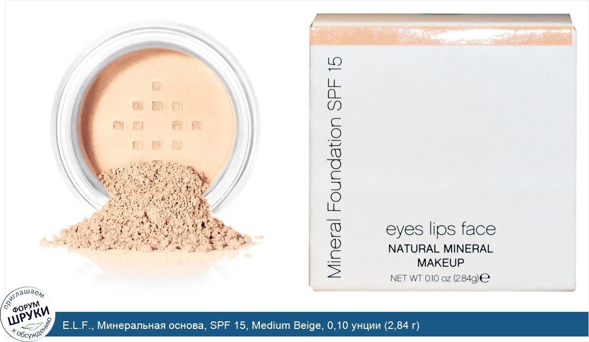 Друзья, если у вас есть отзыв/дополнение/комментарий/вопрос относительно E.L.F., Минеральная основа, SPF 15, Medium Beige, 0,10 унции (2,84 г) - напишите его ответом в эту тему (это будет полезно всему сообществу в целом и вам в отдельности).