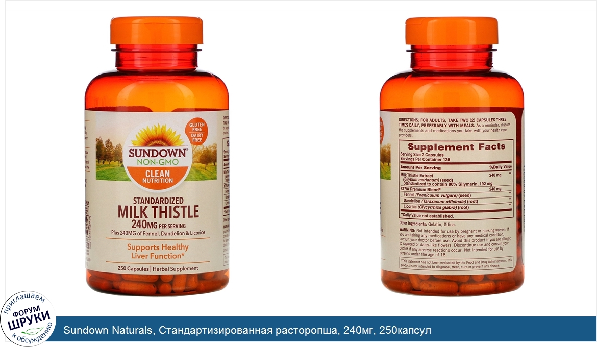 Sundown Naturals, Стандартизированная расторопша, 240мг, 250капсул