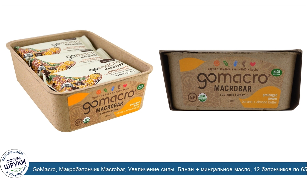 GoMacro, Макробатончик Macrobar, Увеличение силы, Банан + миндальное масло, 12 батончиков по 65 г (2.3 oz)