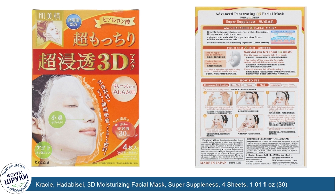 Друзья, если у вас есть отзыв/дополнение/комментарий/вопрос относительно Kracie, Hadabisei, 3D Moisturizing Facial Mask, Super Suppleness, 4 Sheets, 1.01 fl oz (30) Each - напишите его ответом в эту тему (это будет полезно всему сообществу в целом и вам в отдельности).