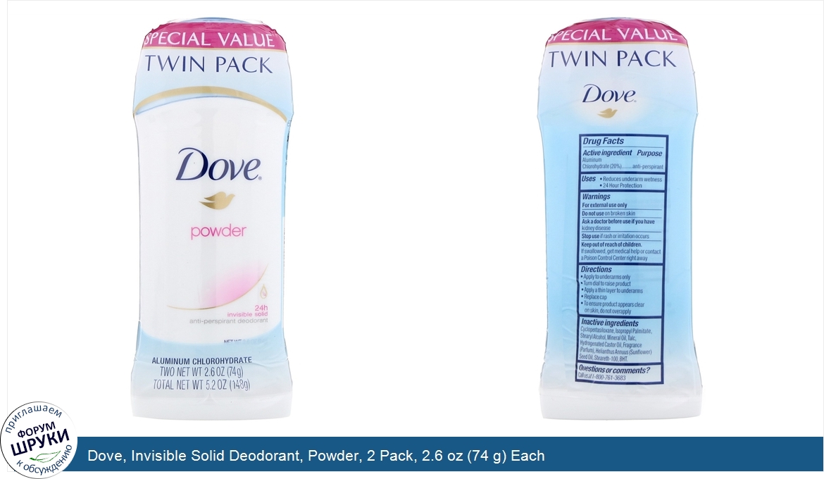 Друзья, если у вас есть отзыв/дополнение/комментарий/вопрос относительно Dove, Invisible Solid Deodorant, Powder, 2 Pack, 2.6 oz (74 g) Each - напишите его ответом в эту тему (это будет полезно всему сообществу в целом и вам в отдельности).