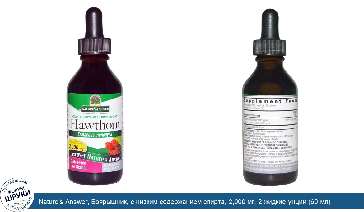 Друзья, если у вас есть отзыв/дополнение/комментарий/вопрос относительно Nature's Answer, Боярышник, с низким содержанием спирта, 2,000 мг, 2 жидкие унции (60 мл) - напишите его ответом в эту тему (это будет полезно всему сообществу в целом и вам в отдельности).