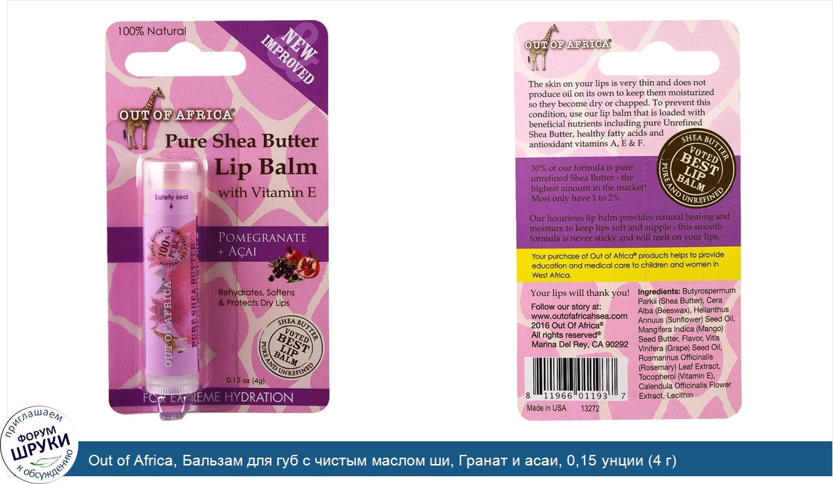 Друзья, если у вас есть отзыв/дополнение/комментарий/вопрос относительно Out of Africa, Бальзам для губ с чистым маслом ши, Гранат и асаи, 0,15 унции (4 г) - напишите его ответом в эту тему (это будет полезно всему сообществу в целом и вам в отдельности).