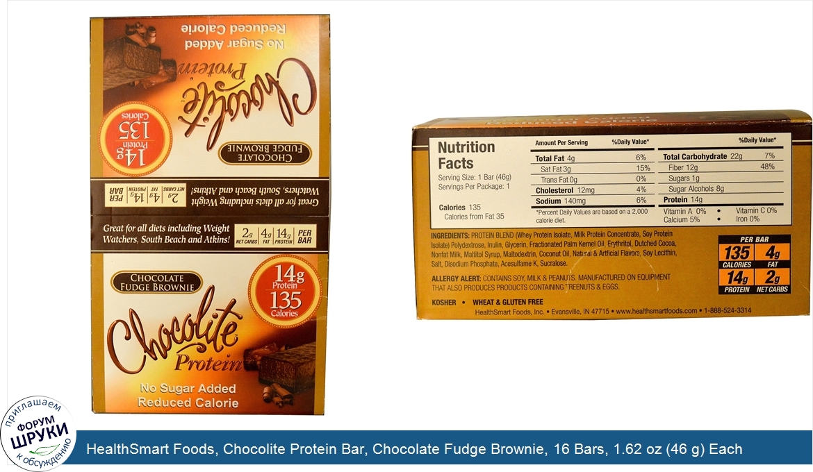 ru HealthSmart Foods, Chocolite Protein Bar, Chocolate Fudge Brownie, 16 Bars, 1.62 oz (46 g) Each