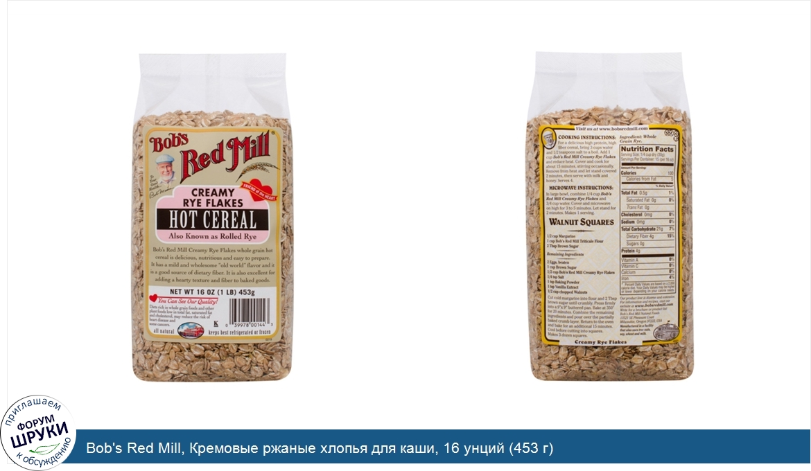 Друзья, если у вас есть отзыв/дополнение/комментарий/вопрос относительно Bob's Red Mill, Кремовые ржаные хлопья для каши, 16 унций (453 г) - напишите его ответом в эту тему (это будет полезно всему сообществу в целом и вам в отдельности).