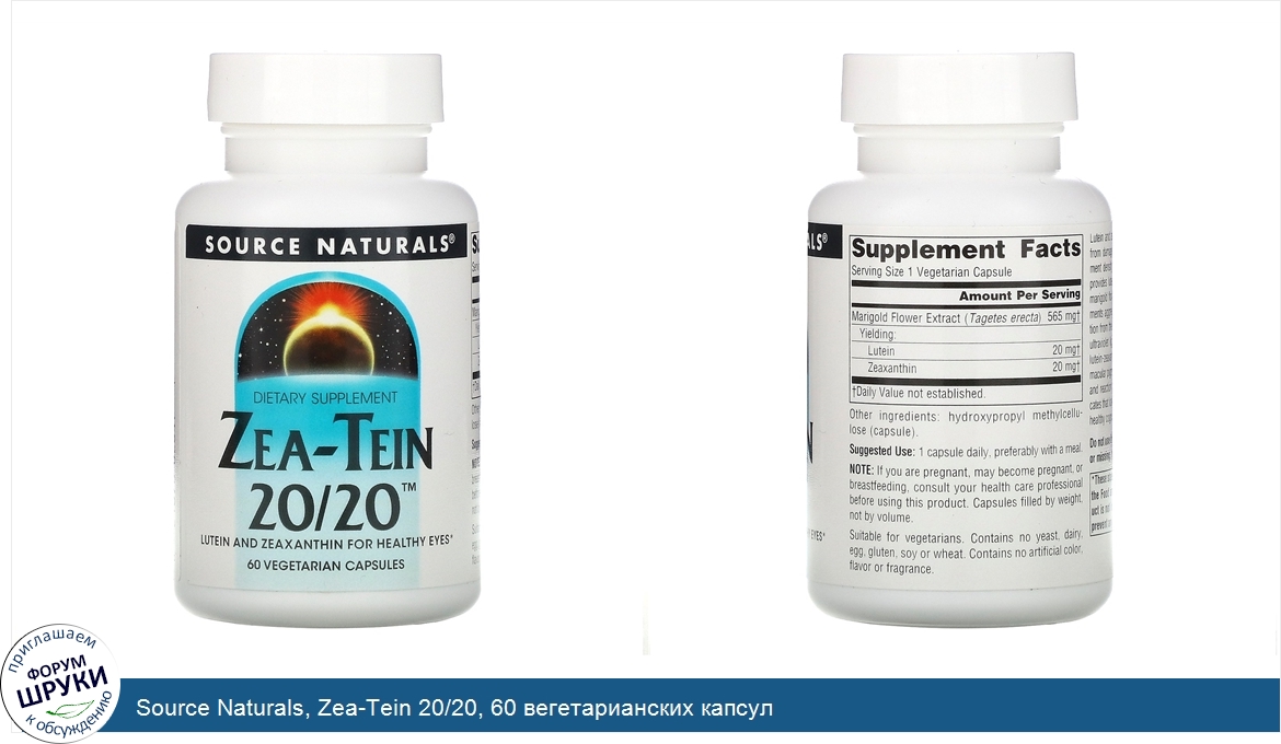 [DESCRIPT]Dietary Supplement. Lutein and Zeaxanthin for Healthy Eyes. Lutein and zeaxanthin help shield the eye’s retina from damage by supporting healthy macular pigment density. Source Naturals Zea-Tein 20/20™ provides lutein and zeaxanthin, sourced from the marigold flower. These important carotenoid pigments aggregate in the retina and provide protection from the damaging effects of free radicals and ultraviolet light. Clinical studies suggest that this lutein-zeaxanthin dosage can support healthy macular pigment density, visual processing speed, and reaction time. Preliminary evidence also indicates that lutein supplementation may help support healthy cognitive performance.[/DESCRIPT]... (описание дополняется)