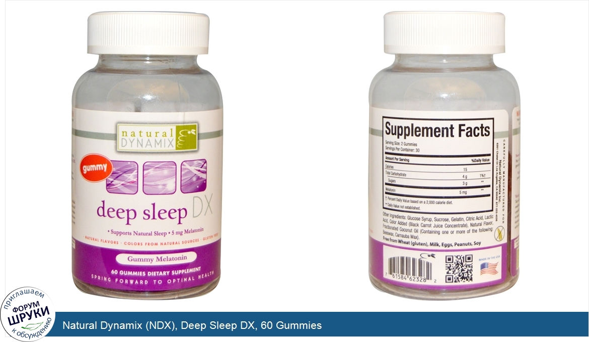 [DESCRIPT]Gummy. Supports Natural Sleep. 5 mg Melatonin. Natural Flavors. Colors from Natural Sources. Gluten Free. Gummy Melatonin. Dietary Supplement. Spring Forward to Optimal Health. Natural Dynamix's Deep Sleep DX has been specially formulated with 5 mg of melatonin and naturally sourced colors and flavors. Deep Sleep DX gummies provide a tasty alternative to hard-to-swallow pills. Natural Dynamix is committed to bringing you the most effective dietary supplements. because we believe in optimal health, naturally.[/DESCRIPT]... (описание дополняется)