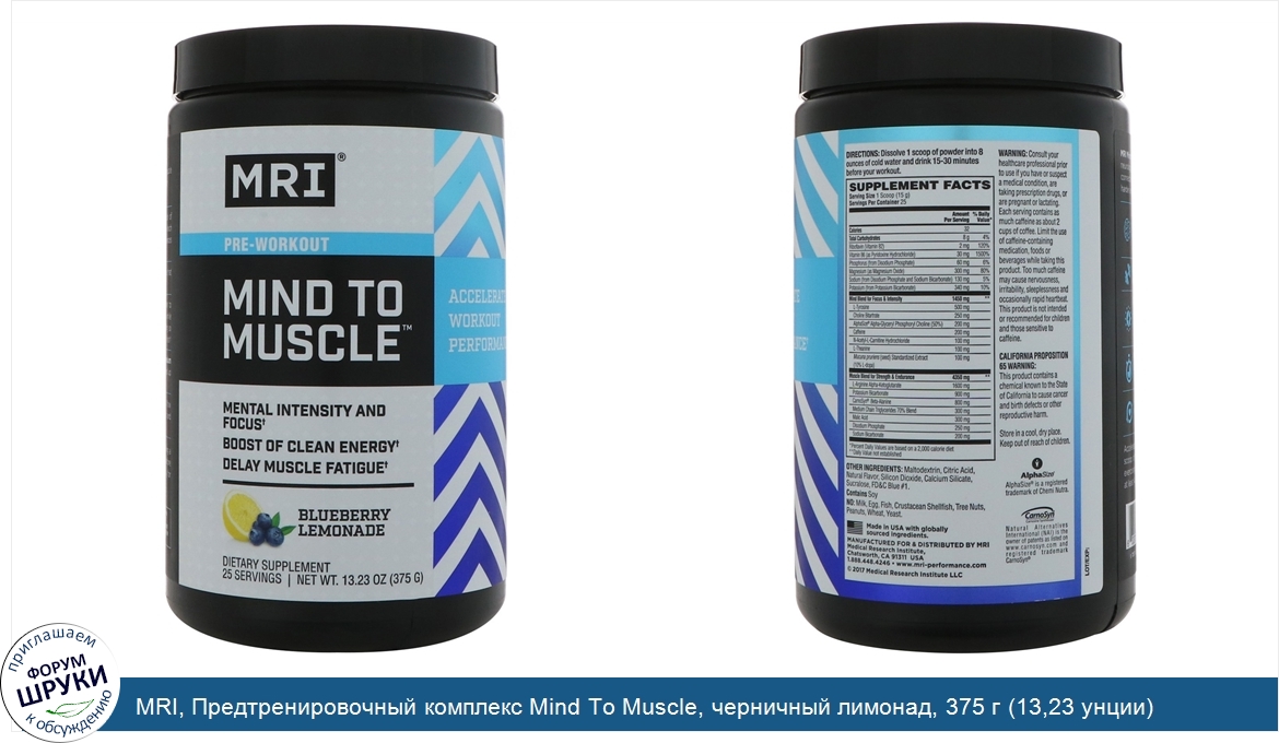 MRI, Предтренировочный комплекс Mind To Muscle, черничный лимонад, 375 г (13,23 унции)