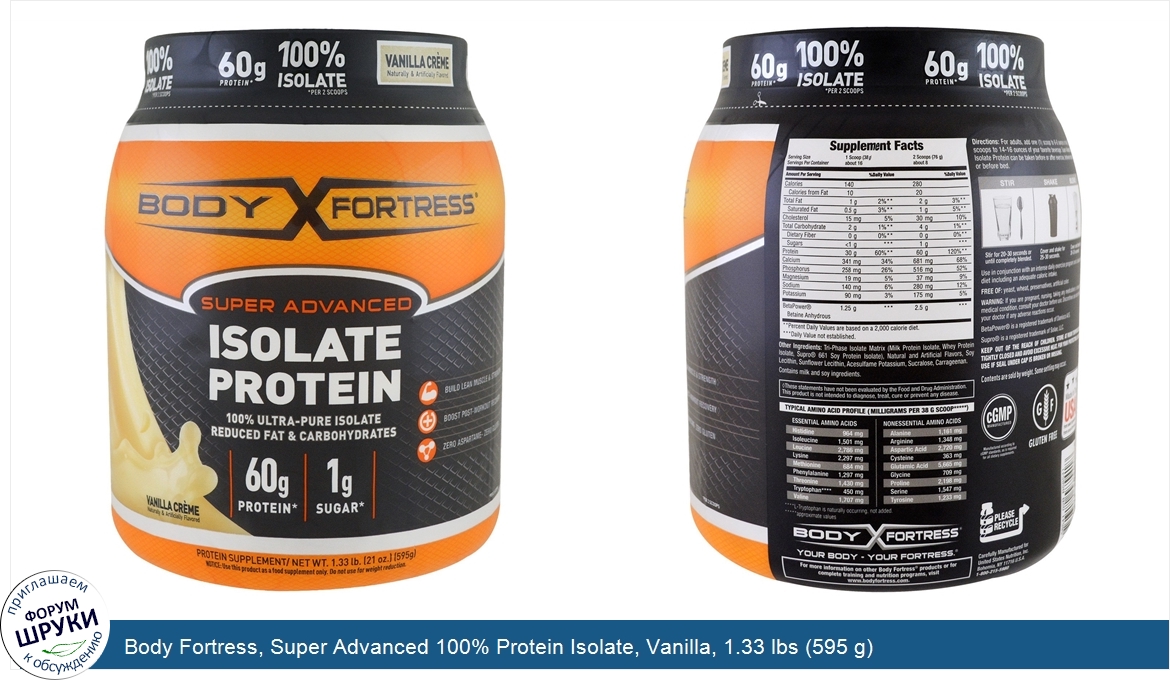 [DESCRIPT]100% Ultra-pure Isolate. Highly Purified Protein to Build Lean Muscle and Strength◊. Sustained-Release Formula to Boost Post-Workout Recovery◊. 12 g of Naturally Occurring BCAAs from Protein*. Contains Zero Aspartame - Zero Gluten - Zero Gimmicks. Body Fortress Super Advanced Isolate Protein is a blend of Whey, Soy, and Milk Protein Isolates with reduced amounts of unwanted fat and carbs. ◊These statements have not been evaluated by the Food and Drug Administration. This product is not intended to diagnose, treat, cure or prevent any disease. *Per two scoop serving.[/DESCRIPT]... (описание дополняется)