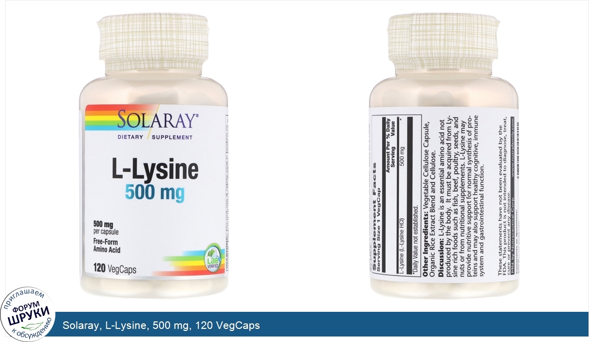 Друзья, если у вас есть отзыв/дополнение/комментарий/вопрос относительно Solaray, L-Lysine, 500 mg, 120 VegCaps - напишите его ответом в эту тему (это будет полезно всему сообществу в целом и вам в отдельности).
