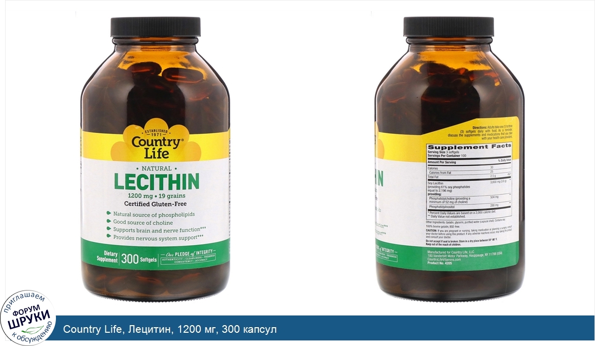 Country Life, Лецитин, 1200 мг, 300 капсул