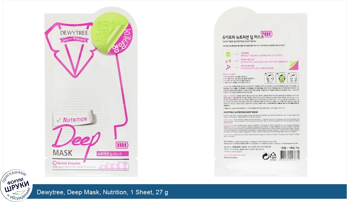 Друзья, если у вас есть отзыв/дополнение/комментарий/вопрос относительно Dewytree, Deep Mask, Nutrition, 1 Sheet, 27 g - напишите его ответом в эту тему (это будет полезно всему сообществу в целом и вам в отдельности).