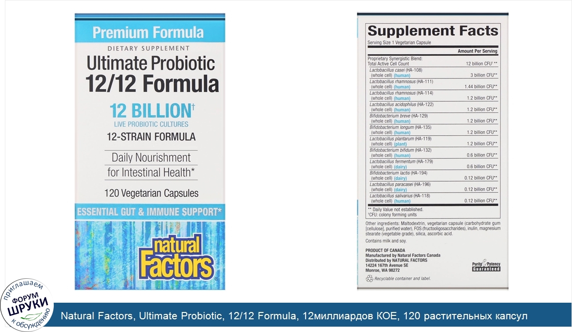 ru Natural Factors, Ultimate Probiotic, 12/12 Formula, 12миллиардов КОЕ, 120 растительных капсул