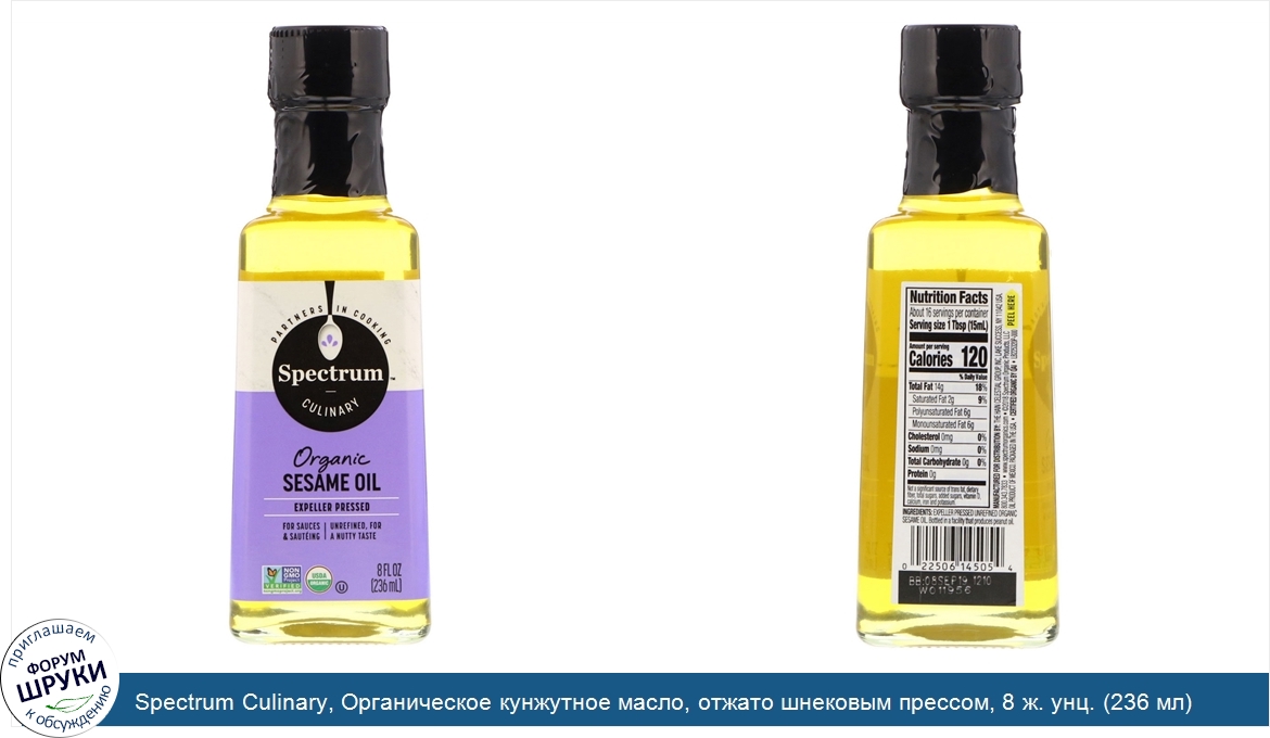 Друзья, если у вас есть отзыв/дополнение/комментарий/вопрос относительно Spectrum Culinary, Органическое кунжутное масло, отжато шнековым прессом, 8 ж. унц. (236 мл) - напишите его ответом в эту тему (это будет полезно всему сообществу в целом и вам в отдельности).