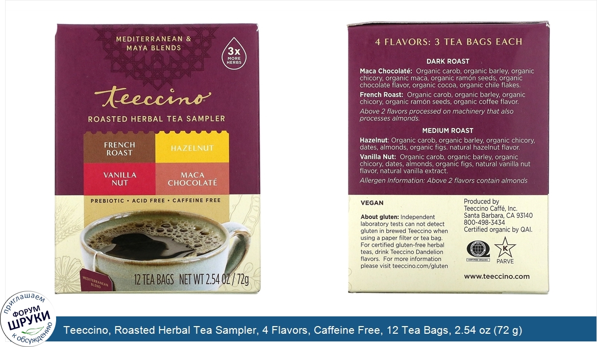 [DESCRIPT]Mediterranean Maya Blends. Acid Free. Prebiotic. French Roast, Hazelnut, Vanilla Nut, Maca Chocolate. 3X More Herbs. 4 Flavors: 3 Tea Bags Each. Certified Organic by QAI. Kosher Parve. Vegan. The Rich And Roasted Herbal Tea®. Whether you're a tea or coffee drinker, you'll love Teeccino's satisfying, robust flavor that fans describe as smoother, richer, and creamier than coffee. The secret? French chicory, of New Orleans coffee fame, blended with barley, Italy's favorite caffeine-free roasted brew, and Spanish carob, famed for its chocolaty flavor. Enriched with Mayan dark roasted ramón seeds or California's almonds, dates and figs, Teeccino makes a delicious cup of tea. or is it coffee? We'll let you decide! 100% naturally caffeine-free. Natural energy boost - from nutrients, not stimulants. Acid free - helps restore alkaline balance. Heart-healthy potassium - for optimal performance. Prebiotic - Inulin, a soluble fiber in chicory root, supports gut health to improve digestion, elimination and the immune system. More Healthy Benefits In Every Cup. Enjoy four enticing blends: two Mediterranean blends with golden roasted almonds and slight sweetness from dates figs ~ two Maya blends with dark roasted ramón seeds for an unsweetened brew. 6 g Tea Bag = 3X More Herbs = Bold flavor and more health benefits! About gluten: Independent laboratory tests can not detect gluten in brewed Teeccino when using a paper filter on tea bag. For certified gluten-free herbal teas, drink Teeccino Dandelion flavors.[/DESCRIPT]... (описание дополняется)