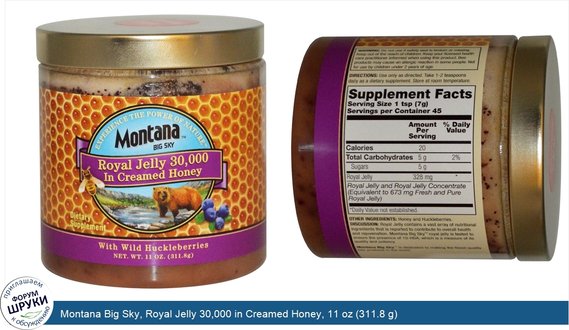 [DESCRIPT]New Improved. Experience the Power of Nature. Dietary Supplement. With Wild Huckleberries. Discussion: Royal Jelly contains a vast array of nutritional ingredients that is reported to contribute to overall health and rejuvenation. Montana Big Sky royal jelly is tested to ensure the presence of 10-HDA, which is a measure of its quality and potency. Montana Big Sky is dedicated to making the finest quality bee products in the world.[/DESCRIPT]... (описание дополняется)