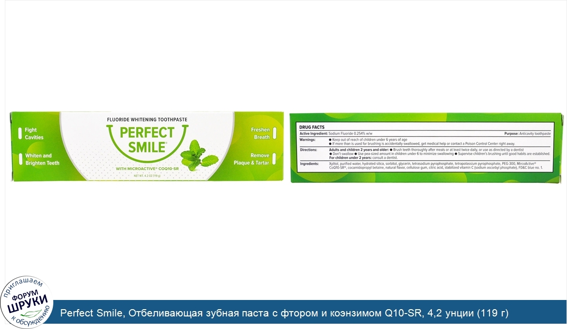 Друзья, если у вас есть отзыв/дополнение/комментарий/вопрос относительно Perfect Smile, Отбеливающая зубная паста с фтором и коэнзимом Q10-SR, 4,2 унции (119 г) - напишите его ответом в эту тему (это будет полезно всему сообществу в целом и вам в отдельности).