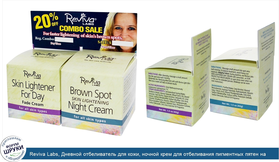 Друзья, если у вас есть отзыв/дополнение/комментарий/вопрос относительно Reviva Labs, Дневной отбеливатель для кожи, ночной крем для отбеливания пигментных пятен на коже, 1.5 унций (42 г) каждый - напишите его ответом в эту тему (это будет полезно всему сообществу в целом и вам в отдельности).