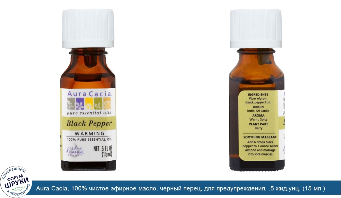 Друзья, если у вас есть отзыв/дополнение/комментарий/вопрос относительно Aura Cacia, 100% чистое эфирное масло, черный перец, для предупреждения, .5 жид.унц. (15 мл.) - напишите его ответом в эту тему (это будет полезно всему сообществу в целом и вам в отдельности).