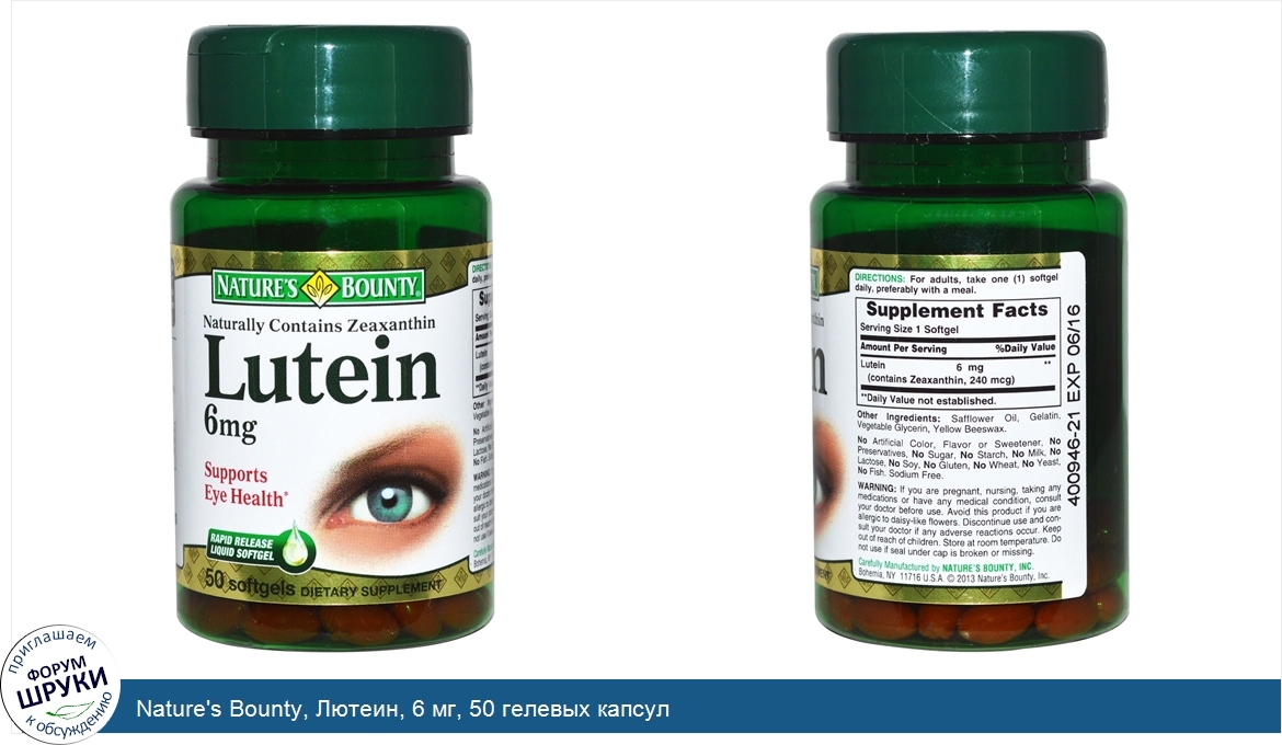 ru Nature's Bounty, Лютеин, 6 мг, 50 гелевых капсул