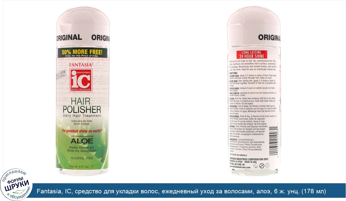 Друзья, если у вас есть отзыв/дополнение/комментарий/вопрос относительно Fantasia, IC, средство для укладки волос, ежедневный уход за волосами, алоэ, 6 ж. унц. (178 мл) - напишите его ответом в эту тему (это будет полезно всему сообществу в целом и вам в отдельности).