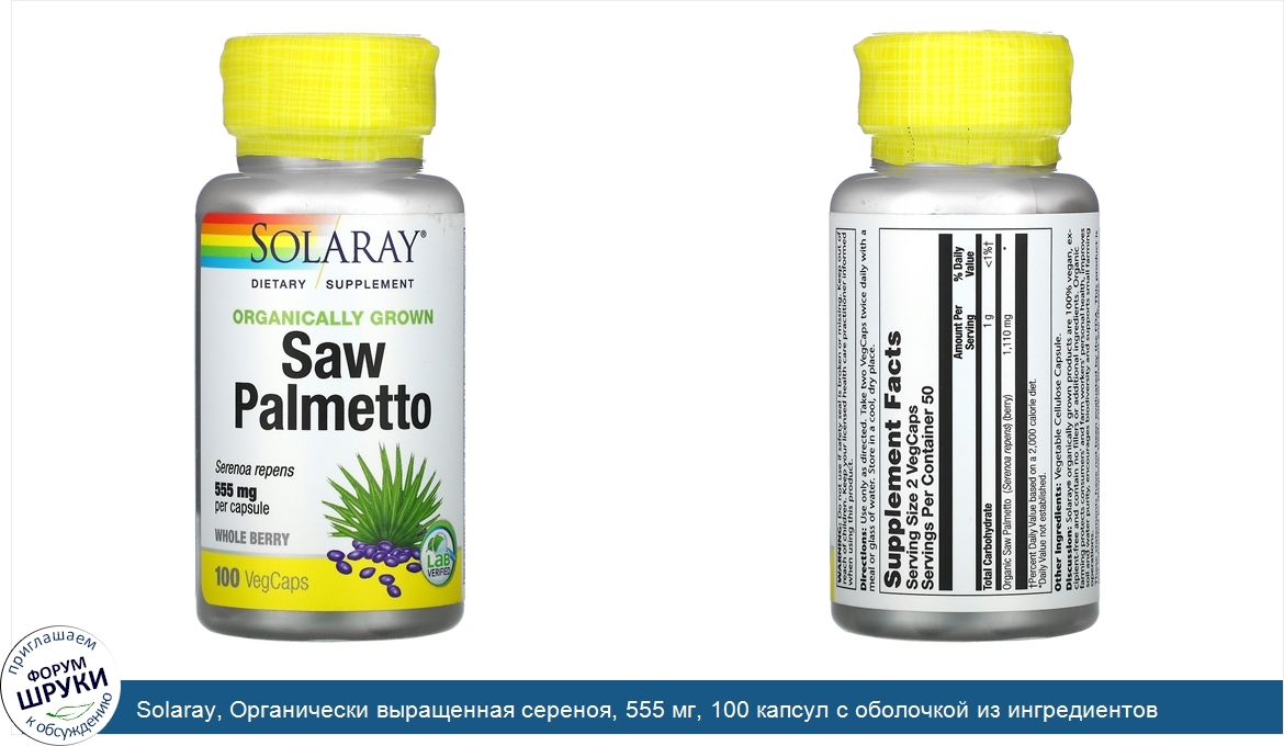 Dietary Supplement. Serenoa Repens. 555 mg Per Capsule. Whole Berry. Lab Verified. Discussion: Solaray®. organically grown products are 100% vegan, excipient-free and contain no fillers or additional ingredients....