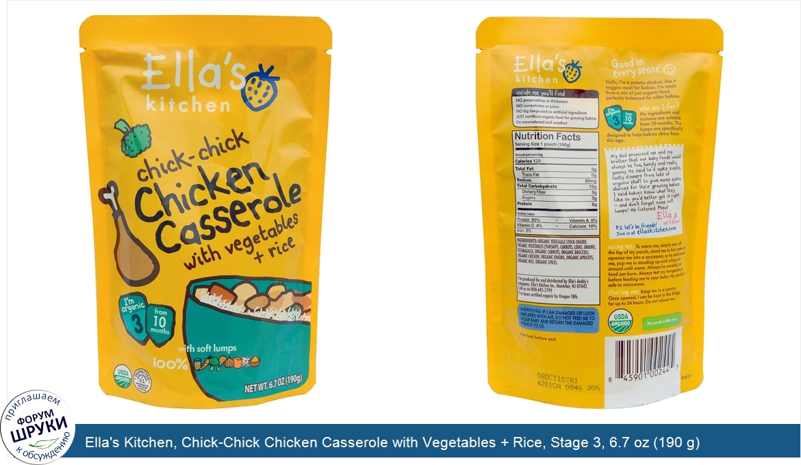 Друзья, если у вас есть отзыв/дополнение/комментарий/вопрос относительно Ella's Kitchen, Chick-Chick Chicken Casserole with Vegetables + Rice, Stage 3, 6.7 oz (190 g) - напишите его ответом в эту тему (это будет полезно всему сообществу в целом и вам в отдельности).